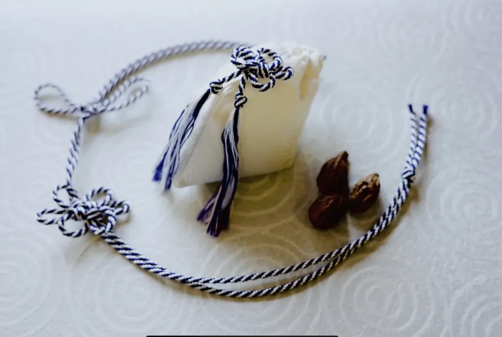 〈涅槃図〉にも描かれている伝統的な訶子(カシ)の実を型どった袋でおつくりいたします。