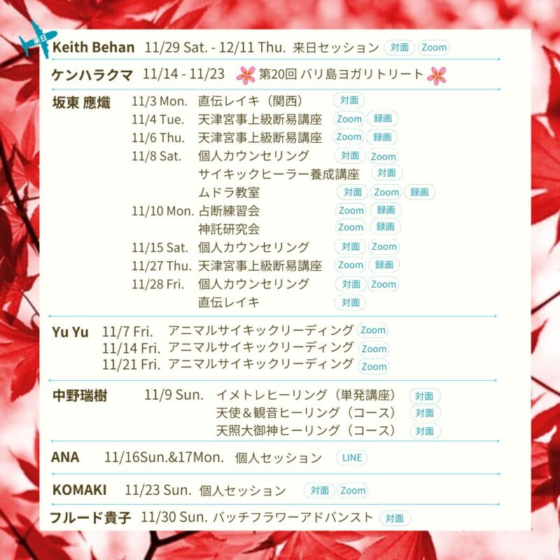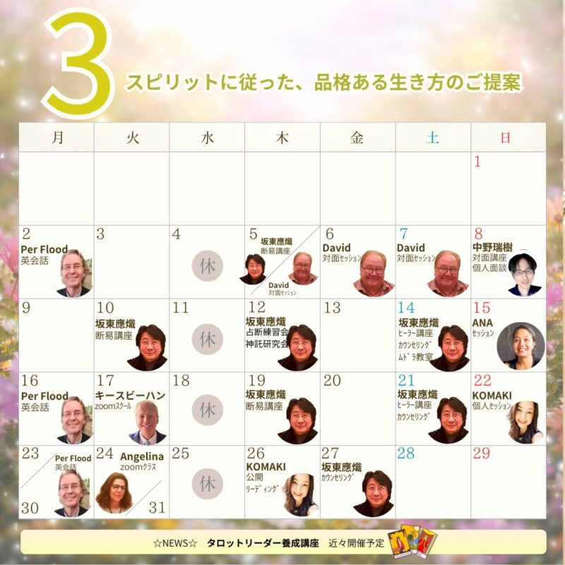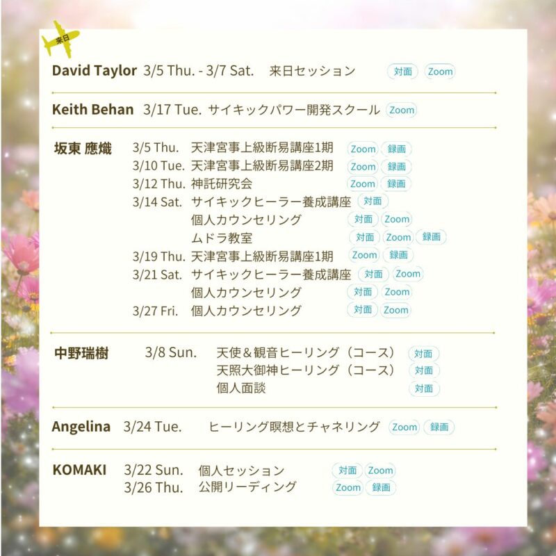 海外、国内より一流のサイキックリーダー、ミディアム、カウンセラーを招いたプライベートセッション、セミナー、養成講座を開催しております。ZOOMにてもお受けいただけます。